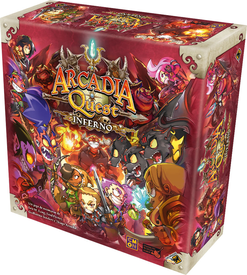 Arcadia Quest: Inferno é um jogo-base completo e também compatível com o jogo original Arcadia Quest. Neste jogo, os jogadores escolhem 3 dos 12 Heróis disponíveis para criar suas guildas, cada um deles com suas próprias habilidades. Conforme avançam em u