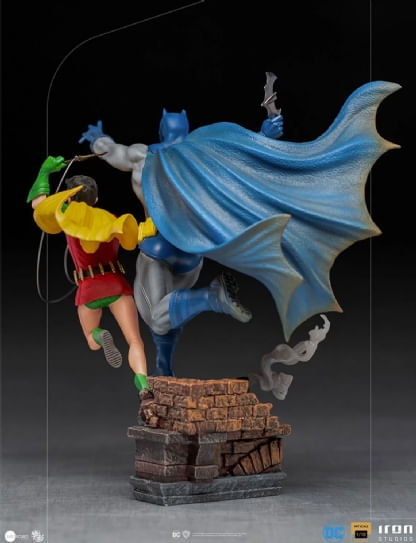 Prontos para arremessar seus batarangues, sobre uma base que remete aos escuros telhados das edificações de Gotham City, Batman & Robin, a mais lendária dinâmica de vigilantes das HQs, salta para o acervo de colecionadore
