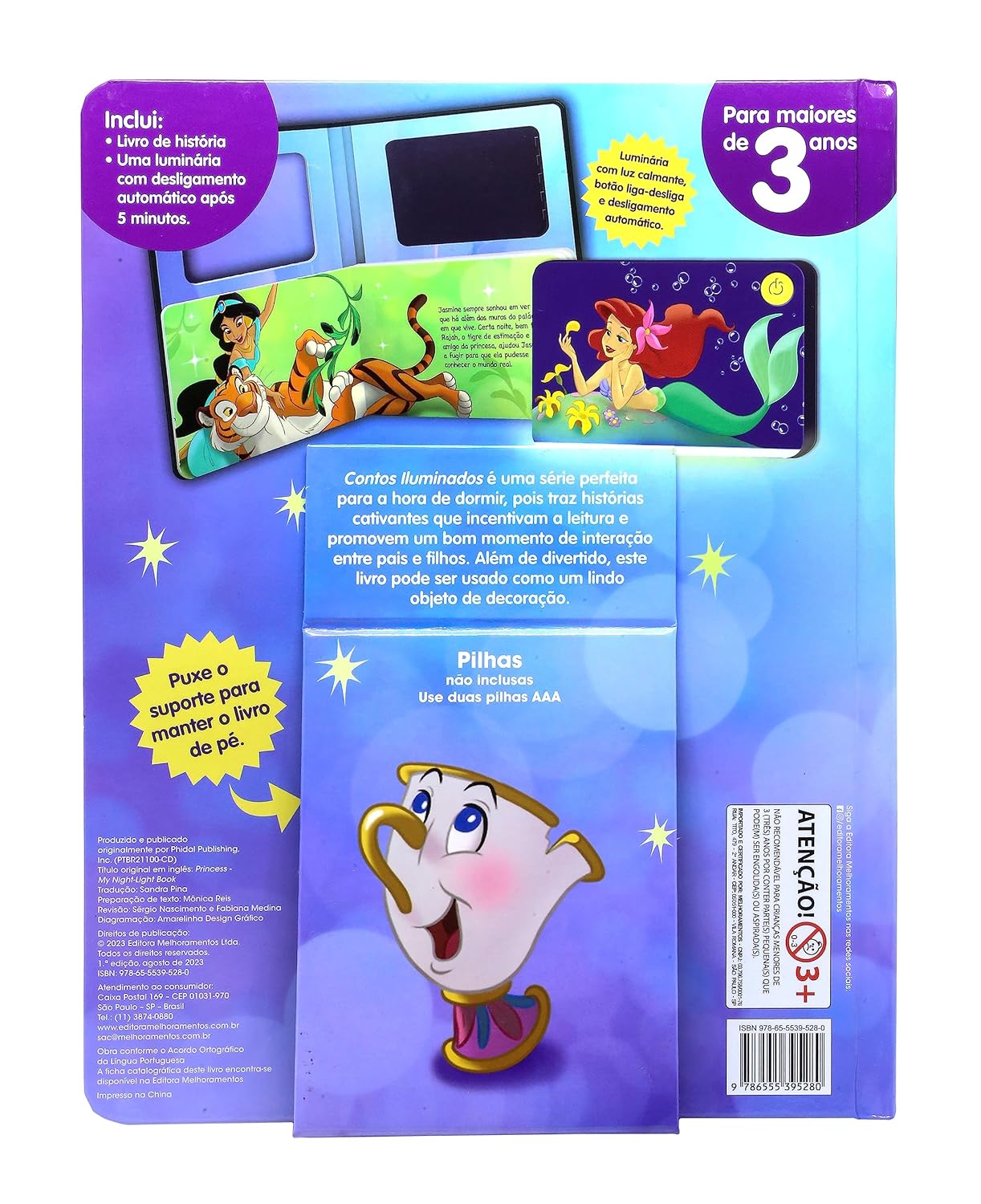 O livro acompanha uma luminária temática com luz calmante, botão liga-desliga e desligamento automático.