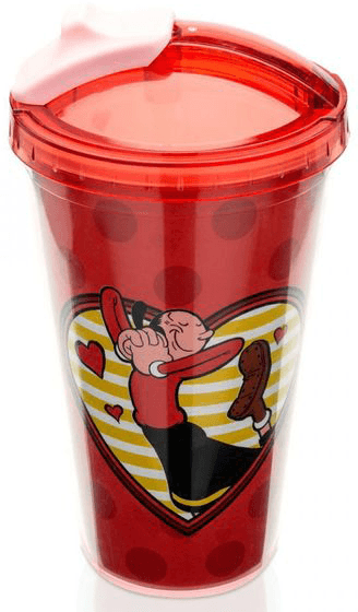 Quem disse que só o marinheiro Popeye deixa os fãs nostálgicos? Sua companheira Olívia também arranca suspiros por aí, trazendo à tona recordações do desenho que marcou a infncia de muita gente. Este copo com canudo é dedicado aos fãs de Olívia Palito. É