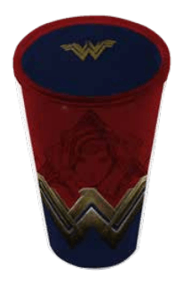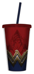 Copo com Tampa e Canudo da Personagem Mulher Maravilha da DC. Incluindo o Logo e a Personagem de Fundo .