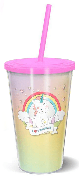Copo canudo parede dupla de 500ml Unicórnio I Love. Copo feito de plástico rigido, com parede dupla e canudo com trava. O impresso é feito de adesivo especial, adesivado no interior do copo, não tendo acesso aos líquidos, dura muito mais e produz um lindo