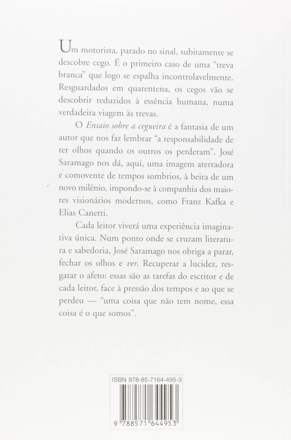 Um motorista parado no sinal se descobre subitamente cego. É o primeiro caso de uma "treva branca" que logo se espalha incontrolavelmente. Resguardados em quarentena, os cegos se perceberão reduzidos à essência humana, numa verdadeira viagem às trevas.O E