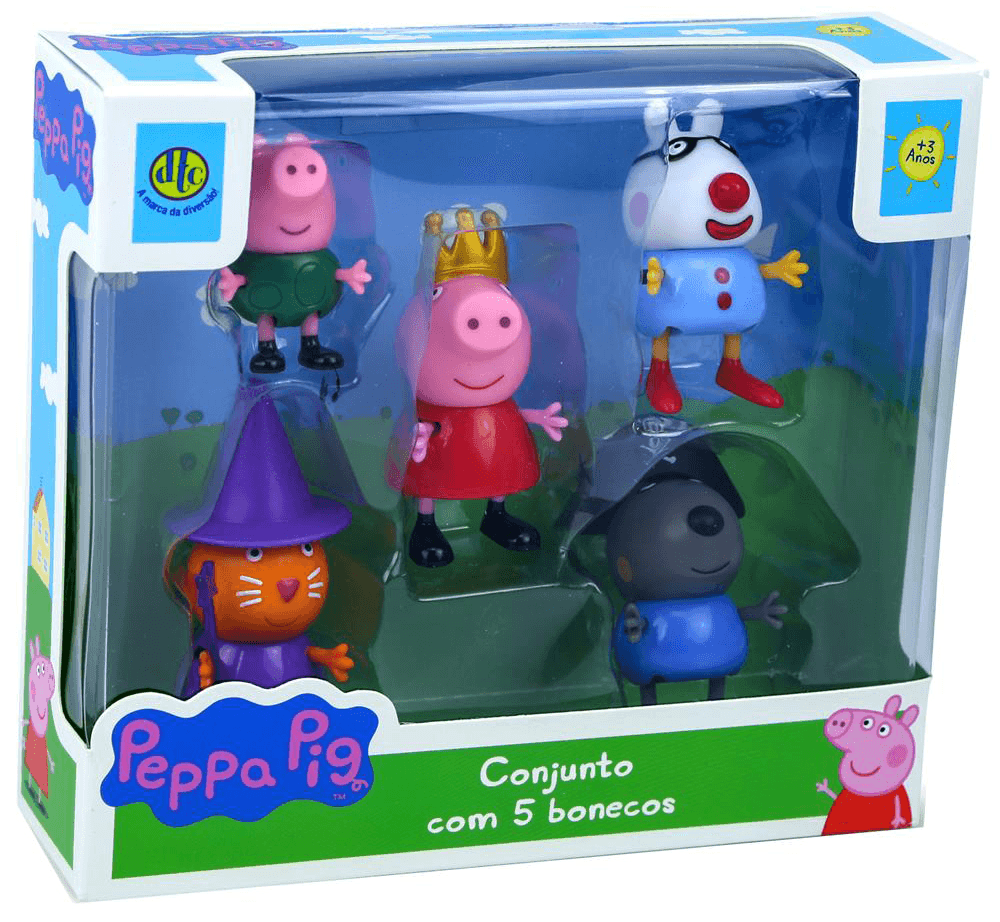 O Conjunto de Bonecos Peppa Pig DTC traz todos os personagens favoritos de Peppa Pig para a criança brincar e colecionar. São cinco figuras que tornam as brincadeiras muito mais divertidas: Peppa, Denny, Candy, Rebeca e o George.