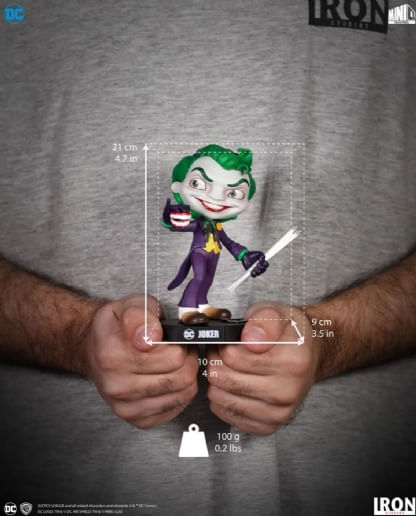 Com um Pé-de-Cabra em uma das mãos e uma dentadura explosiva em outra, a Iron Studios apresenta o clássico Joker (Coringa) estilizado em sua linha Toy Art da Mini Co, com design dos quadrinhos em uma base trazendo seu logo e duas cartas de baralho aos seus pés.