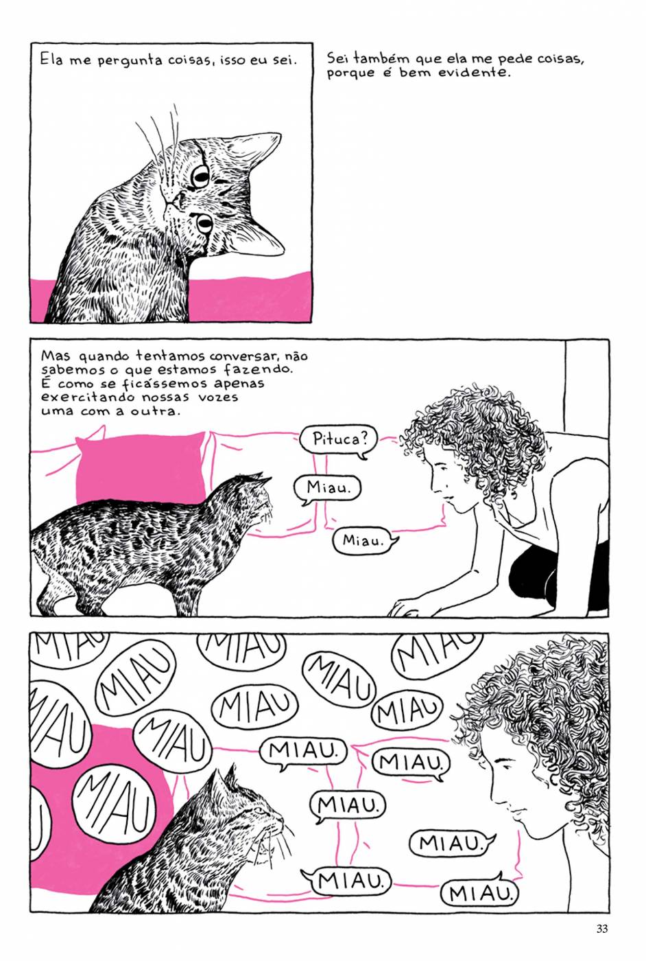 De Deborah Salles e Sofia Nestrovski, Viagem em Volta de uma Ervilha narra as reflexões íntimas de uma estudante de literatura vivendo entre livros e diálogos com sua gata. O escritor britânico Walter Scott já dizia: "Gatos são pessoas misteriosas". E é justamente ao redor dos mistérios da mente de uma gata que acontece a Viagem em Volta de uma Ervilha. Princesa Ervilha, ou Pituca, tem dois anos e foi achada numa caixa de papelão. Sofia, sua dona,tem 25, trabalha para terminar seu mestrado em literatura e pratica kung fu. Juntas, as duas dividem um pequeno apartamento, onde passam o tempo divagando sobre poesia, Shakespeare e a natureza das palavras. Também vivem aventuras ocasionais, quando são sugadas para dentro do universo de seus livros.